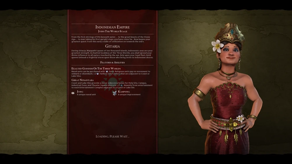 Audacieuse Dyah Gitarja, reine de Majapahit, et de mille autres îles, les mers d'Indonésie sont votre meilleur atout. En tant que déesse exaltée des Trois Mondes, propagez votre influence divine à toutes les eaux touchées par le soleil. Envoyez votre flotte multiplier les conquêtes, courageuse souveraine ! C'est une puissante tempête qui attendra ceux venus chercher le conflit sur les rivages indonésiens.