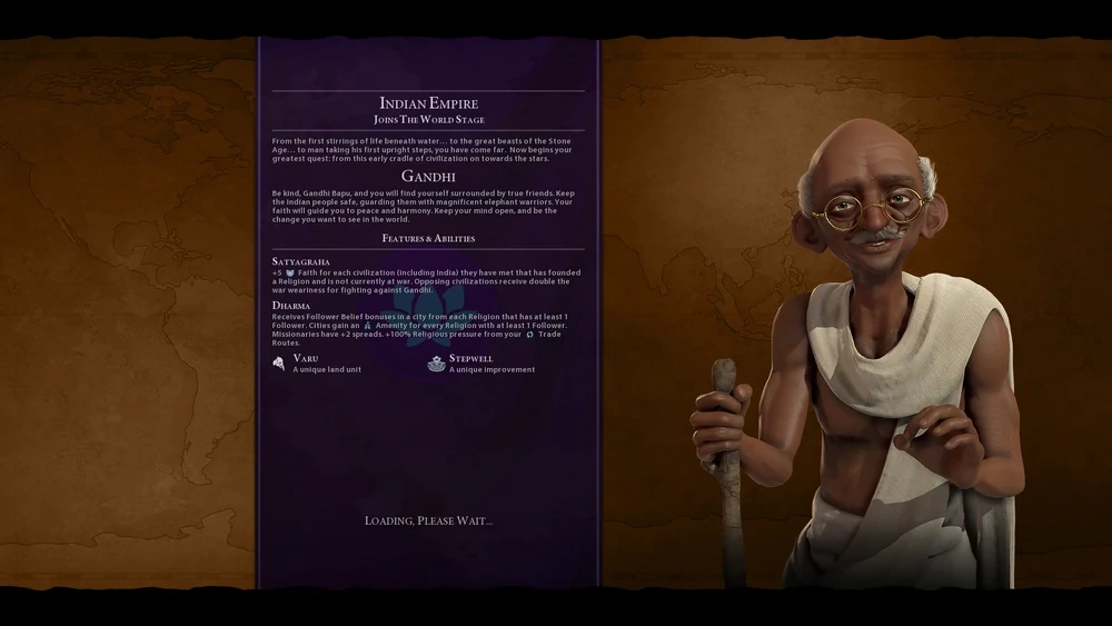 Foi +5 pour chaque civilisation rencontrée (y compris l'Inde) ayant fondé une religion et n'étant pas en guerre. L'usure de la guerre est doublée pour les civilisations qui combattent Gandhi.