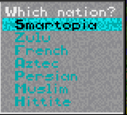 Each civilization is represented by an animated sprite in the Diplomacy screen. Unlike later games, there is no mechanism to track a leader's gender, which is presumed male: Elizabeth I's government titles (Empress, Queen, etc.) are custom-coded to Diplomacy dialogue; they are otherwise masculine in the rest of the user interface, such as the Intelligence screen. Dynamic gender mechanics are first introduced in CivNet.