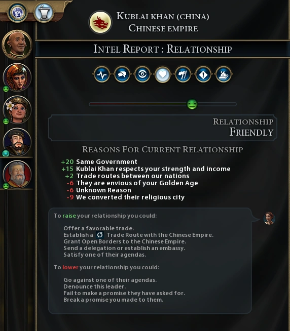 Friendly: You have done some things that make the other leader think well of you. You have a good chance of getting favorable deals with them. You also have a chance to Declare Friendship with them The portraits of friendly rivals display a green smiley.- Neutral: Your actions have earned neither the other leader's trust nor mistrust. Your interactions with them will be standard. The leader's portrait has no icons whatsoever.