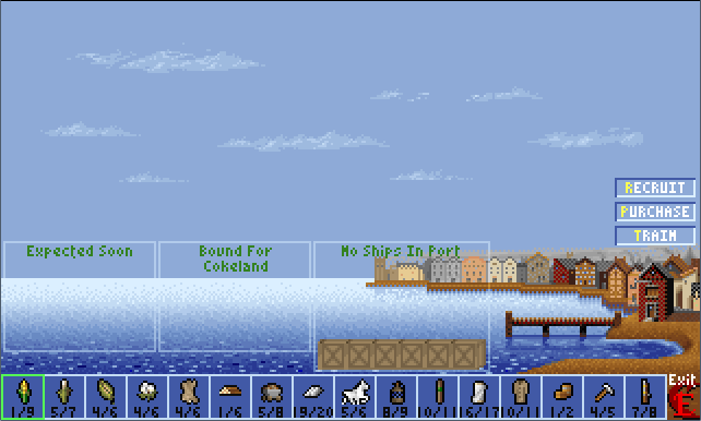 "Recruit" lets you select a unit who is willing to emigrate for religious reasons. You must pay the balance of their transit cost. Crosses speed up the availability of recruits; the cost to you is based on how many turns remaining until the unit would be able to emigrate for free. The recruit pool always contains three units. When a unit has been recruited, it appears on the docks, ready to board your ship, and a new unit is placed in the pool.