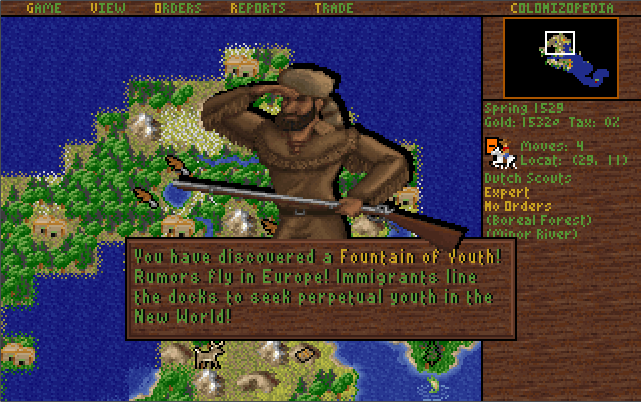 In the original Colonization, you see a screen with a large bubbling spring in a jungle and the title "Fountain of Youth", and when you click on that you return to the map and see a superimposed message box saying "You have discovered a Fountain of Youth! Rumors fly in Europe! Immigrants line the docks to seek perpetual youth in the New World!". The box offers a choice of three immigrants in the same style as you get when clicking "Recruit" in Europe, saying "Which of the following individuals shall we recruit?". Choose one of the three offered. You choose eight altogether. If you are lucky, there will be no servants or criminals offered.