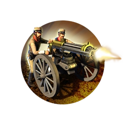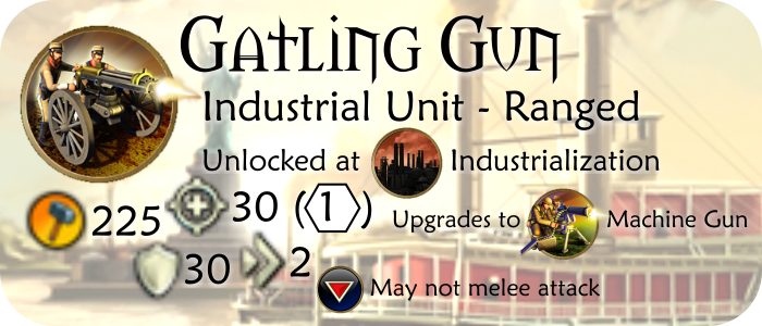 The Gatling Gun is an upgrade from the Crossbowman, but its role changes entirely, and together with the Artillery and aircraft, it ushers in a complete change to combat tactics in modern times. The first repeating gun weapon, it is able to spit lead with incredible speed and mow down incoming infantry. Although its bullets can't reach 2 tiles away like the attacks of earlier ranged units (it has only 1 range), it still attacks with impunity. Furthermore, its