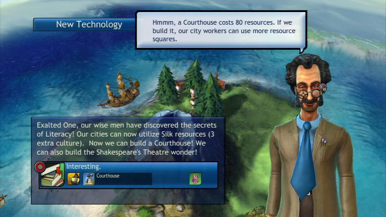 The player has just discovered Literacy, which allows access to Silk and unlocks Courthouses and Shakespeare's Theatre.