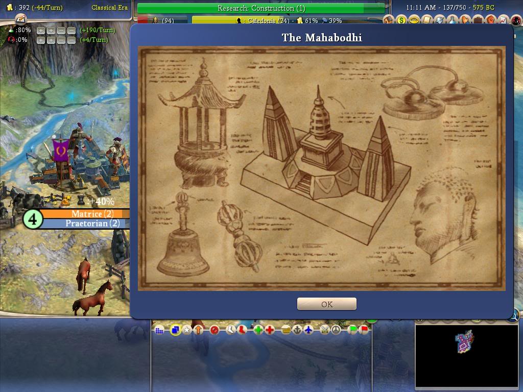 The Mahabodhi (Buddhist Shrine) produces one gold each turn for every city in the world that practices Buddhism. It also spreads Buddhism throughout the world and increases its city's chance of generating a Great Prophet.