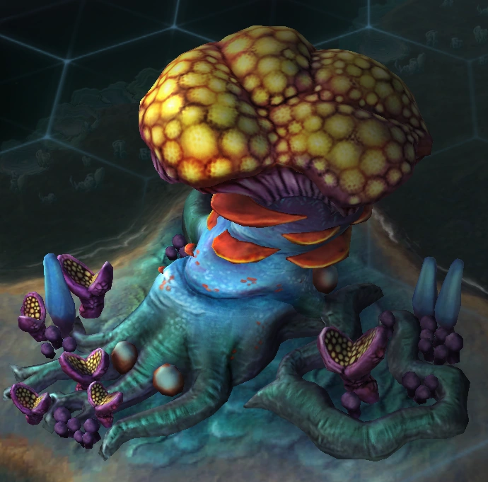 - Description: This ancient fungus was once the largest member of a planet wide super-organism. An underground network of mycelium connected each mountain-sized specimen into a single massive being. Over centuries, these fungi were gradually covered by spores and debris. They exist now in a dormant, yet living state.