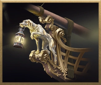 English Pointer Figurehead | Every ship will sense the closest unseen ship within 20 hexes. | The dog is pointing and holding a lantern hanging down from its mouth. The lantern mysteriously glows brighter the more that figurehead points in the direction of the nearest ship. |
