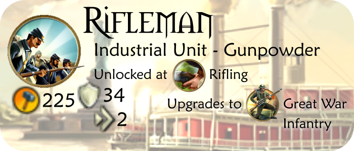 The Rifleman is the result of a significant upgrade in small firearms technology during the late Renaissance/early Industrial Era. The invention of new loading systems allows a unit to shoot many more bullets per minute than with earlier weapons, and a new design of the barrel of the gun gives its projectile a much greater boring force. The soldiers that use these new rifles are substantially more powerful than Musketmen, giving the army of a civilization with Riflemen a big advantage over armies that don't have them yet.