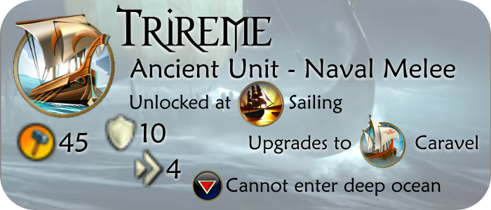 The Trireme is the first naval unit available to civilizations in the game. It depends on a combination of sails and oars to move, which gives it a decent speed, but makes it very unstable in open seas, and thus unable to traverse ocean tiles. It is a melee unit with a modest Melee Combat Strength and thus only usable against other sea vessels, or in the utmost case to attack coastal cities.