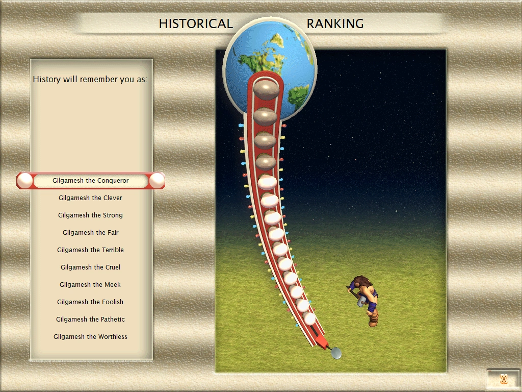 A histograph looks at the total "Score" generated by all civilizations turn by turn over the course of the game. The civilization that generated the highest score—on average—wins. Being powerful in Ancient Times is just as valuable as being powerful in the Modern Era.