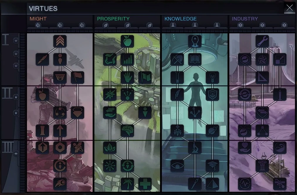 Virtues are an orthogonal system to complement and augment your technology choices and play style. Whereas a player's technology path may be a series of adaptive choices to the environment and circumstances, Virtues represent the player's long-term choices about style and flavor which are more removed from immediate circumstances.