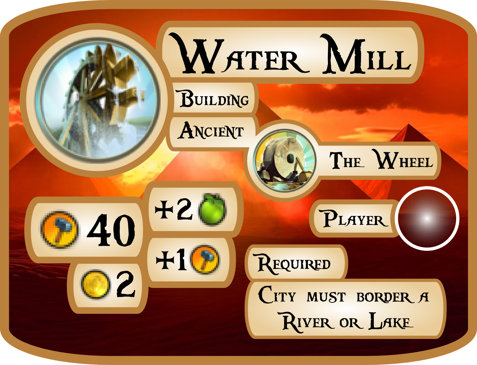 The Fan-Made Info card for the Water Mill Building (Civ5)