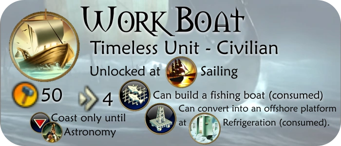 The Work Boat is a naval unit, which means that it can only be constructed in coastal cities. It can be used to improve water resources such as